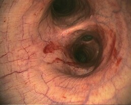 Zudem lag zum Untersuchungszeitpunkt eine deutliche Reizung der Luftröhre vor. Im Bereich der Bronchialaufteilung wurde eine frische Blutung aus dem linken Hauptbronchus sichtbar, vermutlich ausgelöst durch den starken Hustenreiz (Abb. 3).